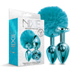 Adorn your derriere with the NIXIE Metal Butt Plug Set. Adorn your derriere with the metallic small pom pom tail and the medium faux-aquamarine jewel plug. Smooth-plated, slick metal finish in lightweight aluminum alloy. Tapered tip and smooth, seamless material create an easy insertion. Comfortable plugs stay in place. Flared base for easy retrieval. Easily warmed or cold for temperature play.